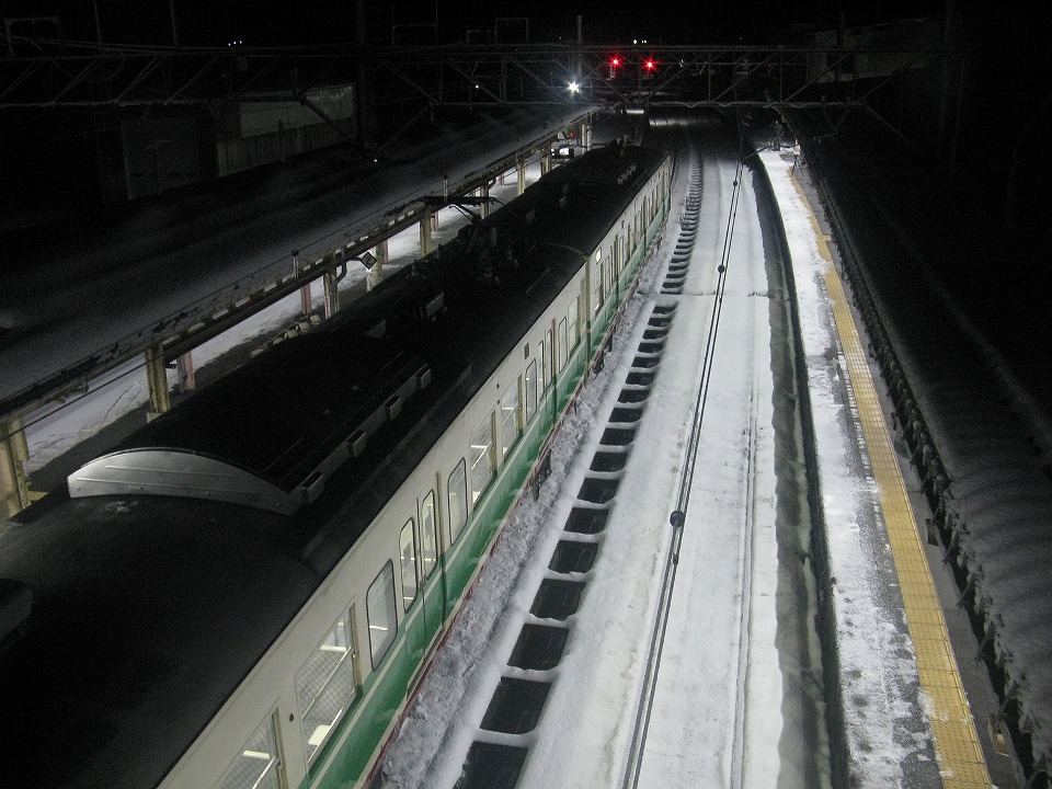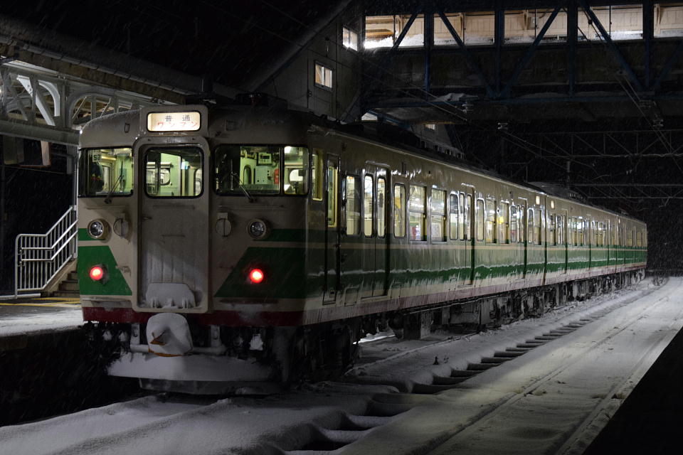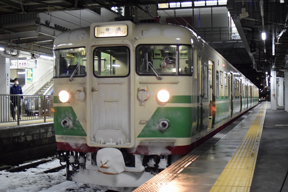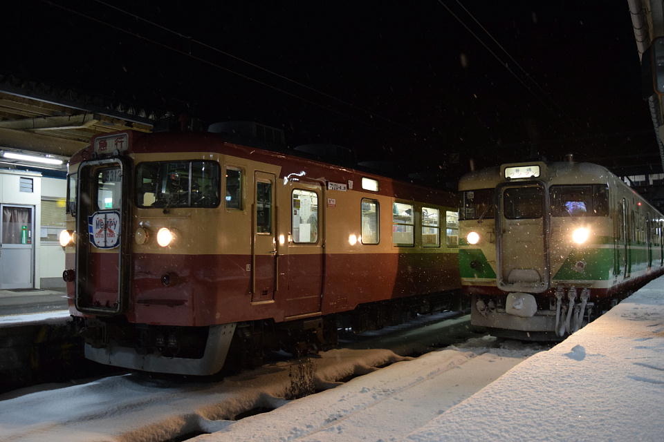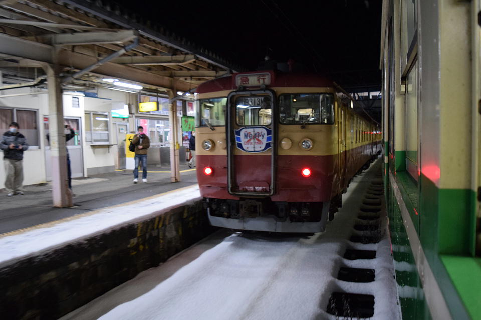 | 356Mの発車2分前になって、夜行急行「HolyNightExpress」が到着した。 ヘッドマークは、「Merry Christmas」だ。 夜行急行のドアが開いたら、115系の並びを撮影しようとたくさんのテツがワサワサと降りてきた。 慣れてない雪のホームを走るとすっ転ぶゾ。 |