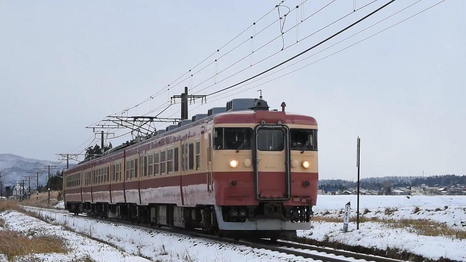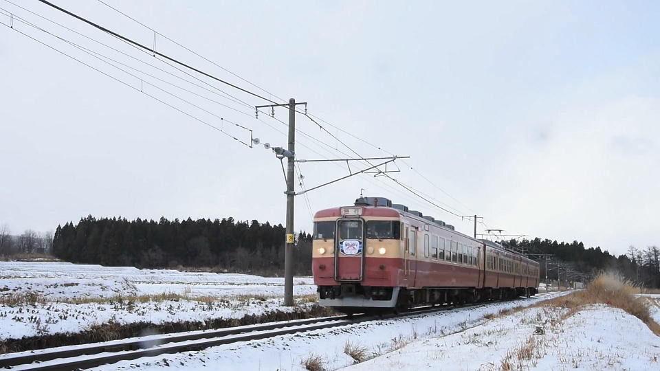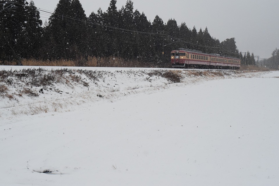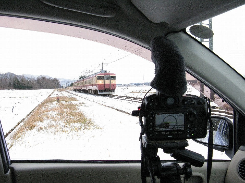 | 雪や霰(あられ)が降っているので 上り快速をどこでどのように撮影しようか検討した結果、 関山駅近くの田んぼのあぜ道のようなところにした。 俺らが着いたときには松本ナンバーの先客がいて、2人が長い三脚と脚立でスタンバっていた。 その後程なくして、長岡ナンバーのレンタカーで大学生風の2人も来た。 そのうちの1人は、クルマの外でくわえたばこをしていた。 カッコ悪いぞ。 雪や霰で器材が濡れるのがイヤなので、結局ジャンクのデジイチ+レンズのセットを使って、 手持ちで写真のみ撮影することにした。 アングルは、雪に覆われた田んぼを手前に大きく入れて撮影。 それまで小康状態だったのに、ちょうど電車がやって来るってタイミングでバラバラと霰が降ってきた。 なので、この写真に写っている雪のようなのは直径数ミリの霰だ。 |
