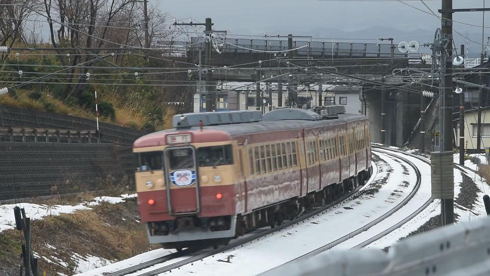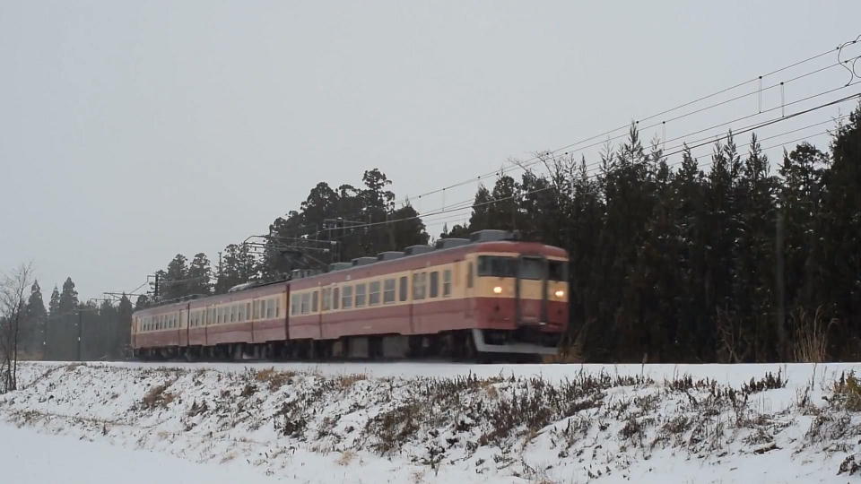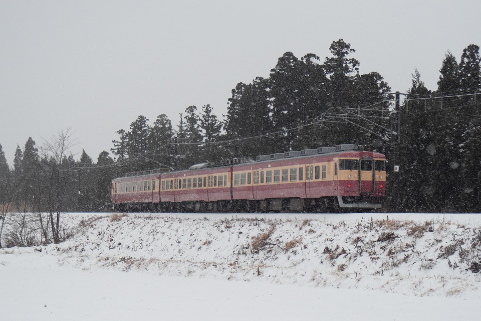 | 直江津を発車した「急行1号」は後追いで撮影。 市振に向けて、今度はまっすぐの旧北陸本線を走っていった。 さっきの下り快速到着を撮影したあと、天気がまた荒れてきたので車撮にした。 約52秒の動画はこちら。 |