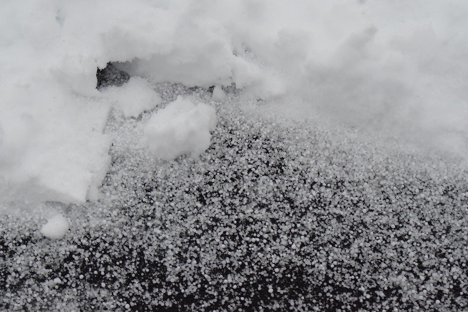 | こんな霰が降ってきてアタマに当たると痛い…。 さらに、上り快速の撮影後に画像を確認しようとデジイチのディスプレイを見るため、 何気なく下を向いて操作していたら襟首の後ろから入った霰のツブが 背中をつつ~っと伝って、冷てー冷てー。 |