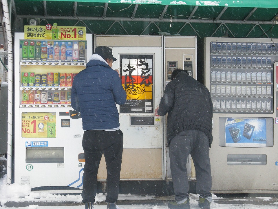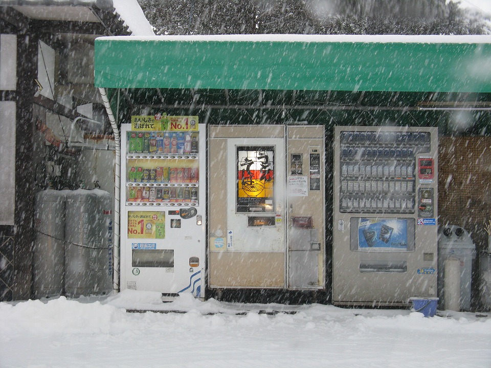 | メリークリスマス!(まだ前の日=俗にいうイヴだけど。) 北陸に大雪をもたらした雲が信州にも雪を降らせ、 長野市内は一晩で真っ白になった。 今日は先輩もご同行くださる。 まず455・413系の快速のみサクッと撮影し、その後、長野電鉄に転戦する。 快速の撮影前には当然「う・そ自販機」で朝メシ! |