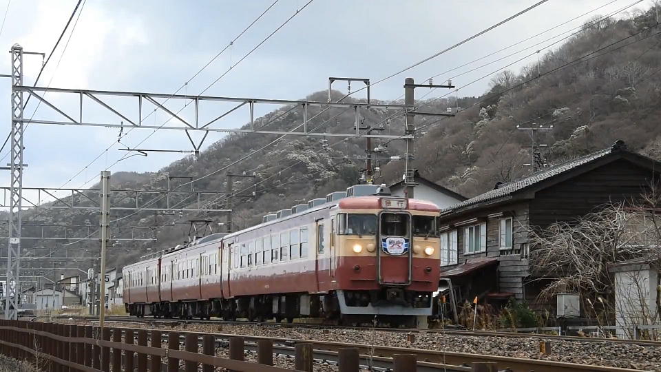 | 「急行2号」は湯殿トンネル近くで後追いで撮影。 相変わらずの荒天のため、これも車撮。 約26秒の動画はこちら。 車内ではハイト(高さ)を稼げないので画の左下にガードレールが映り込んでしまっているが、ご愛敬だ。 「ゆる~く撮影」がモットーだからいいのだ。 |