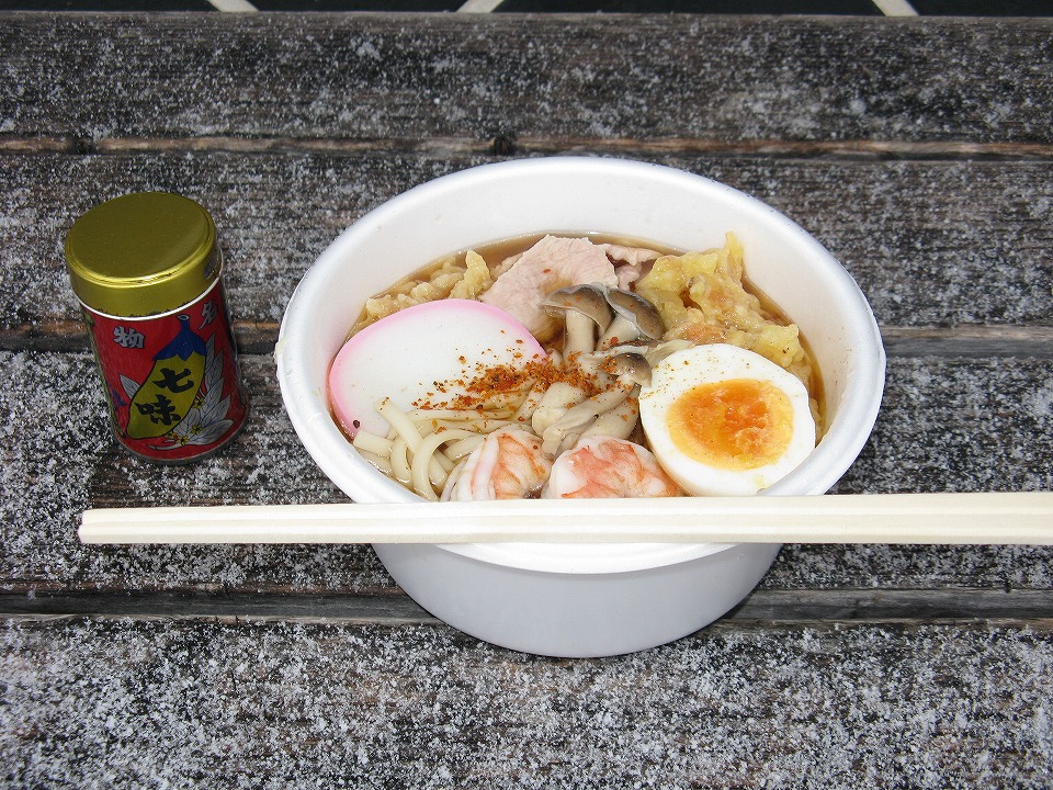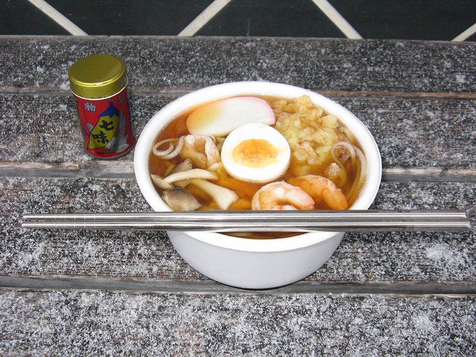 | おはよ~さんでございます。 メリークリスマスでございます。 今日も元気に撮影行! まずは「う・そ自販機」でハラごしらえですね。 今回は月見は茹でた孫もとい、茹で卵にしてみたよ。 七味も八幡屋礒五郎を持ってきた。 |