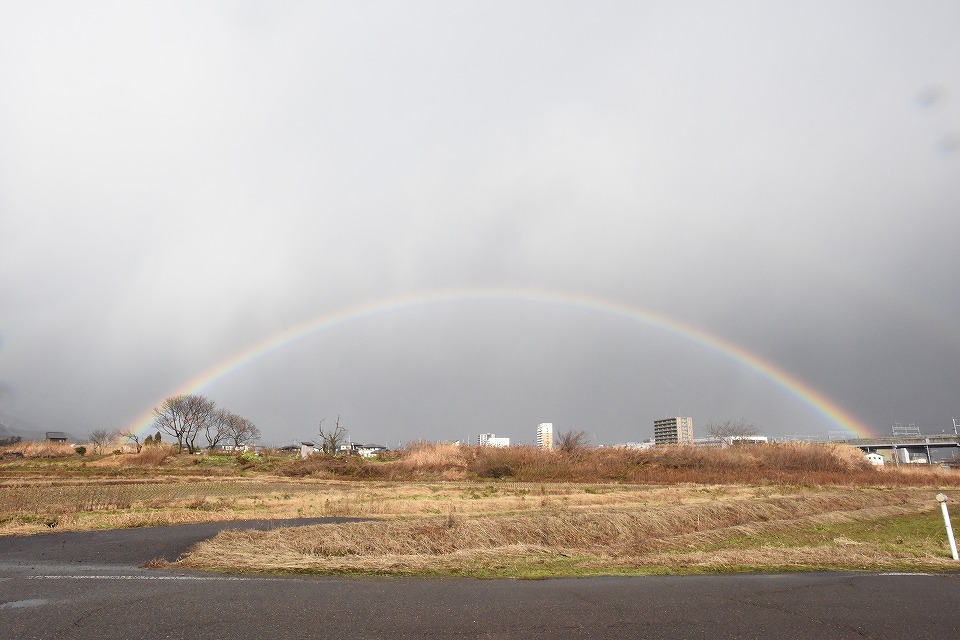 | 下り快速をどこで撮影しようかと上越妙高駅周辺をウロチョロしていたら、 虹が出た。 うっすらと副虹も見える。 虹と上り快速を一緒に撮影したいな~。滅多にないチャンスだもんね。 この虹の撮影時、電車が来るまでまだ24分もあった。 一般的に虹はそんなには長く持たないが、一応狙ってみることにした。 この写真はフルサイズの17mmで撮影。 何とか画角に収まった。 |