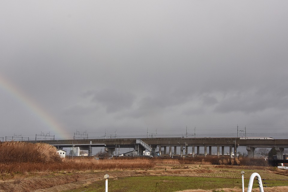 | 「虹よ持ってくれ」と祈りつつ、クルマの中で待機していたら、 北陸新幹線「はくたか553号」がゆっくり通っていった。 しまった! 新幹線を入れて撮影するテもあったんだ、と悔しがって 念のためエロ本(=時刻表)を見てみたら、 なんと今日は臨時の「かがやき521号」がすぐに来るではないか! 上越妙高で、「はくたか553号」が「かがやき521号」を待避するんだね。 ということで、虹とはちょっと距離があるけど慌てつつもとりあえず撮影した。 最後部の1号車しか写っていないが、他の車両は防音壁に隠れている。 |