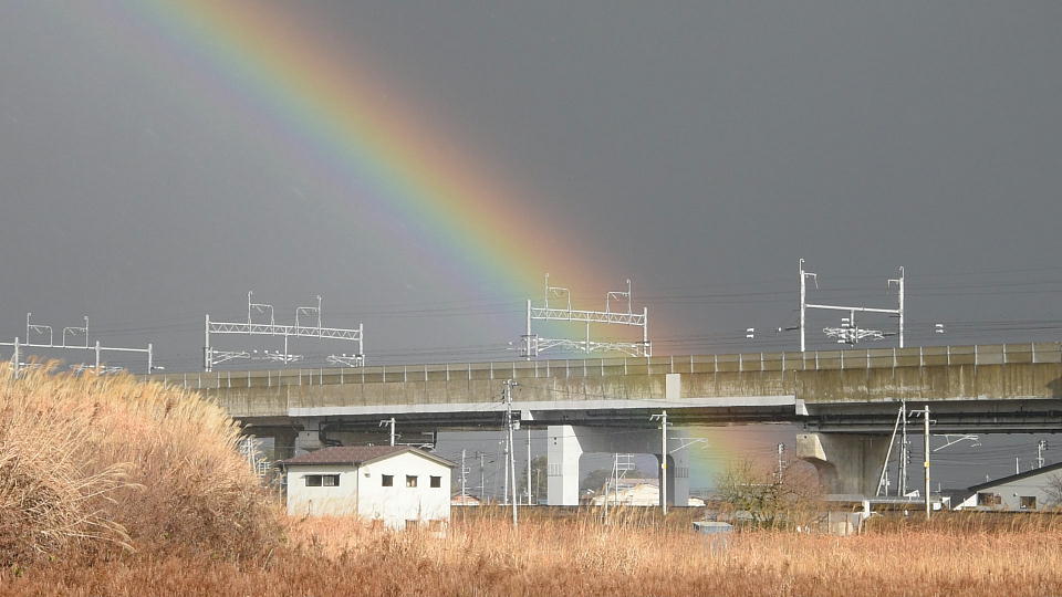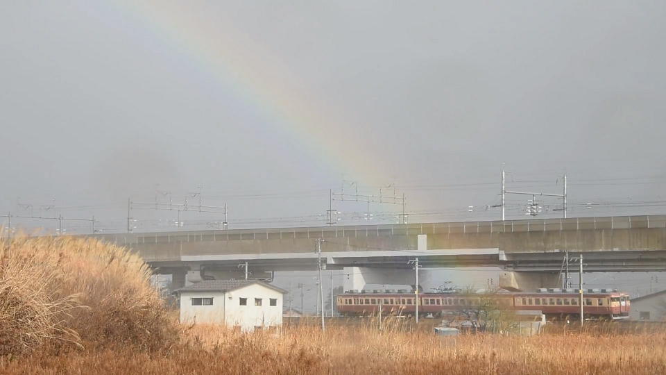 | 雨や霰が断続的に降るので、下り快速は車撮する。 この画は、電車が来る3分前のテスト撮影からのキャプチャー。 虹は長いこと持ってくれている上、色がかなり濃くなった。 下り快速には今すぐに来てほしい~。 |