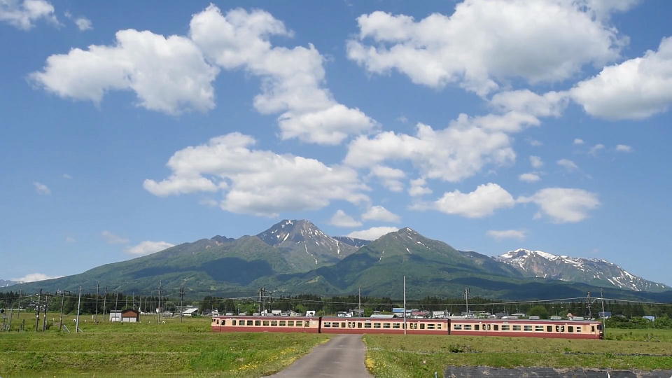 気持ちいい空の下、妙高山をバックに上り快速が妙高高原に向けて走る。
