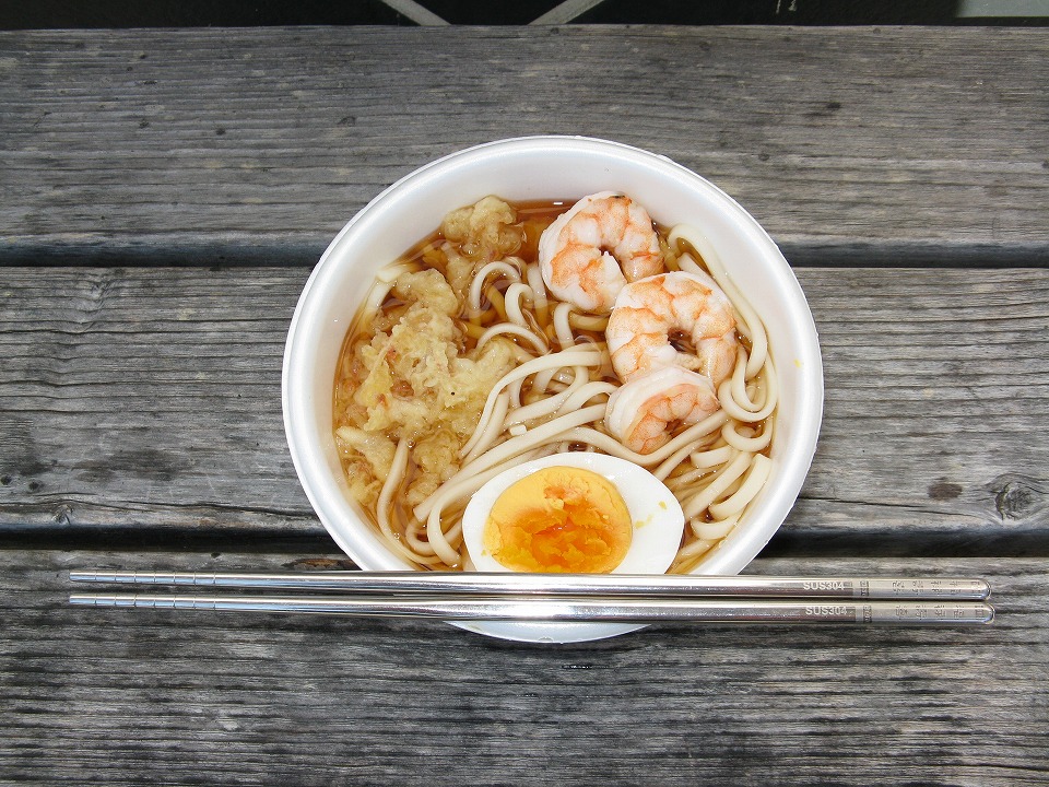 自宅から半熟茹で卵と茹でエビを持って来てトッピングだぁ。