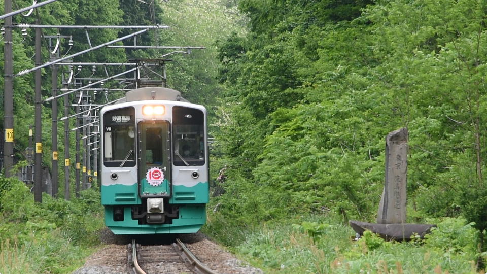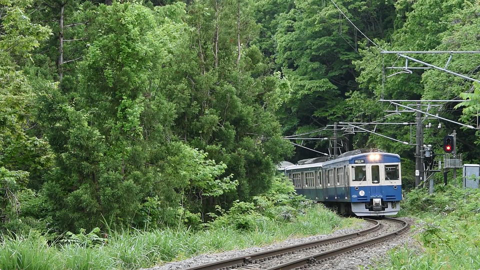 | さて、撮影に入るゾ。 天気が曇りでも新緑が眩しい中を、練習として撮影した2347M。 そしたら嬉しいことにスカ色じゃないか! うまいことラッピングするもんだねぇ。 この電車は実は6連で、先頭からの2両のみがスか色だから、この画像は3両目以降が見えないタイミングで動画からキャプチャーした。 通過シーンの、約25秒の動画はこちら。 |
