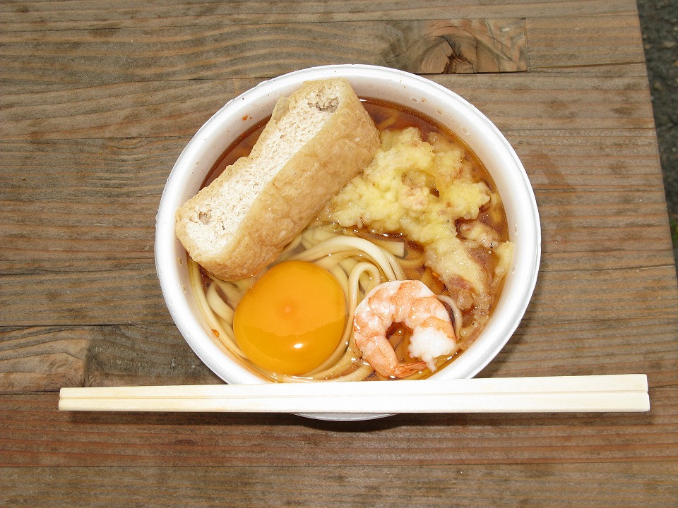 | 天ぷらそば250円ナリ。 相変わらず「う・そ自販機」が現役なのも嬉しいし、値段が変わっていないのも嬉しい。 栃尾揚げ・卵・茹でエビは、トッピングとして自宅から持って来た。 |