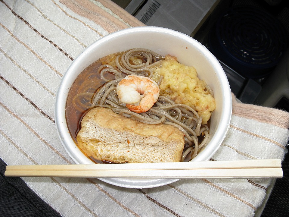 | 天ぷらうどんの次は天ぷらそば250円ナリも食す。 自宅にあった卵が1個だけだったので、こっちは「月見」にできなかった。 ベンチのすぐ横の喫煙スペースでヤンキー夫婦がタバコを吸い始めたので、 クルマに避難してきて撮影。 |