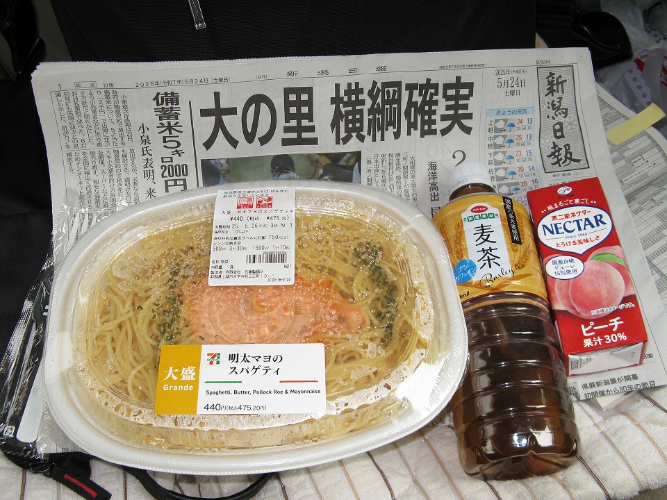 | 妙高での撮影が終わり、高速で糸魚川に移動した。 イレブン屋のパスタでハラごしらえする。 地元紙では、糸魚川(旧能生町)の中学と高校を出た大関「大の里」が優勝して横綱昇進を確実にした記事が1面トップを飾っていた。 |