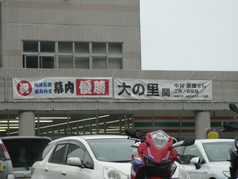 | 国道8号沿いの道の駅「能生」には横断幕が掲げられていた。 ほぼ地元だから盛る上がってるんだね。 |