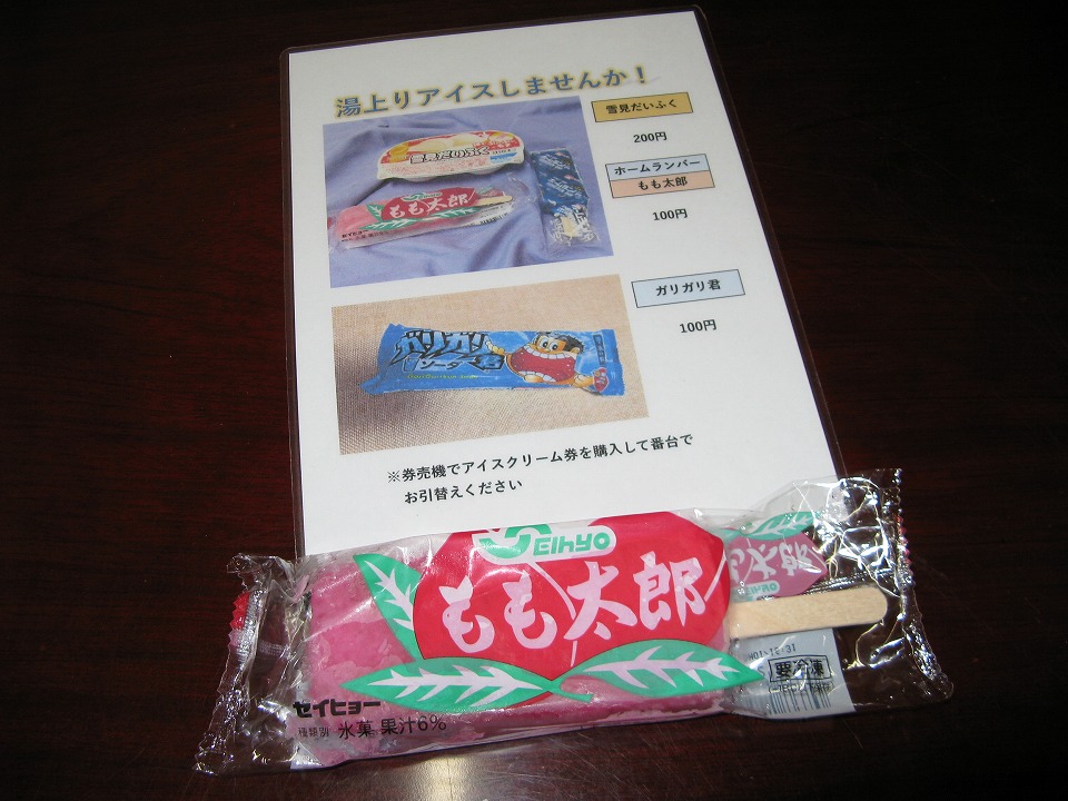 | 上越地域にあるここ「大湯」でも、主に下越地域のソウルアイスである「もも太郎」が喰えるのが嬉しい。 100円ナリだが、下越ではコンビニでは75円で売っている。 でも、「大湯」で風呂上がりに喰えるんなら、多少高くてもよいのダ。 なお、「もも太郎」は桃味ではないからね。詳しく知りたきゃググってね。 |