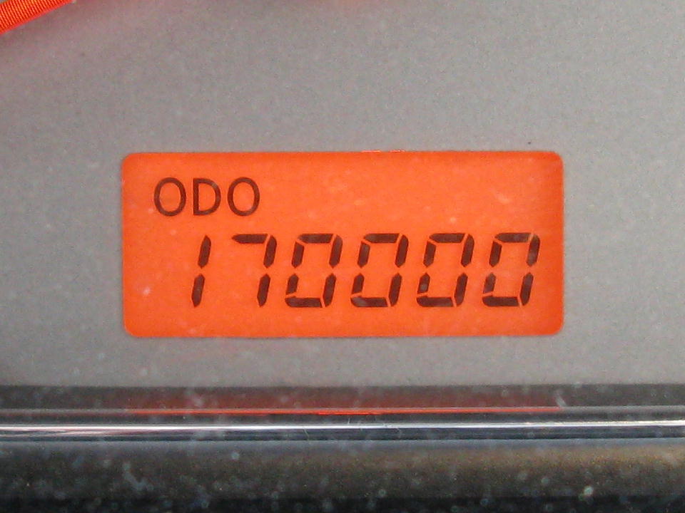 | 帰宅直前のオドメーター。あとちょっとで170000km。 走行距離がキリよくなるときは、ちょうどになるのを見届けようといつも直前まで気にしてるんだけど、 いつも気が付いたら数キロ越えてた、ってことがこれまでもよくあった。 さて、今回はどうかな。後日結果を追記しようと思います。 |
