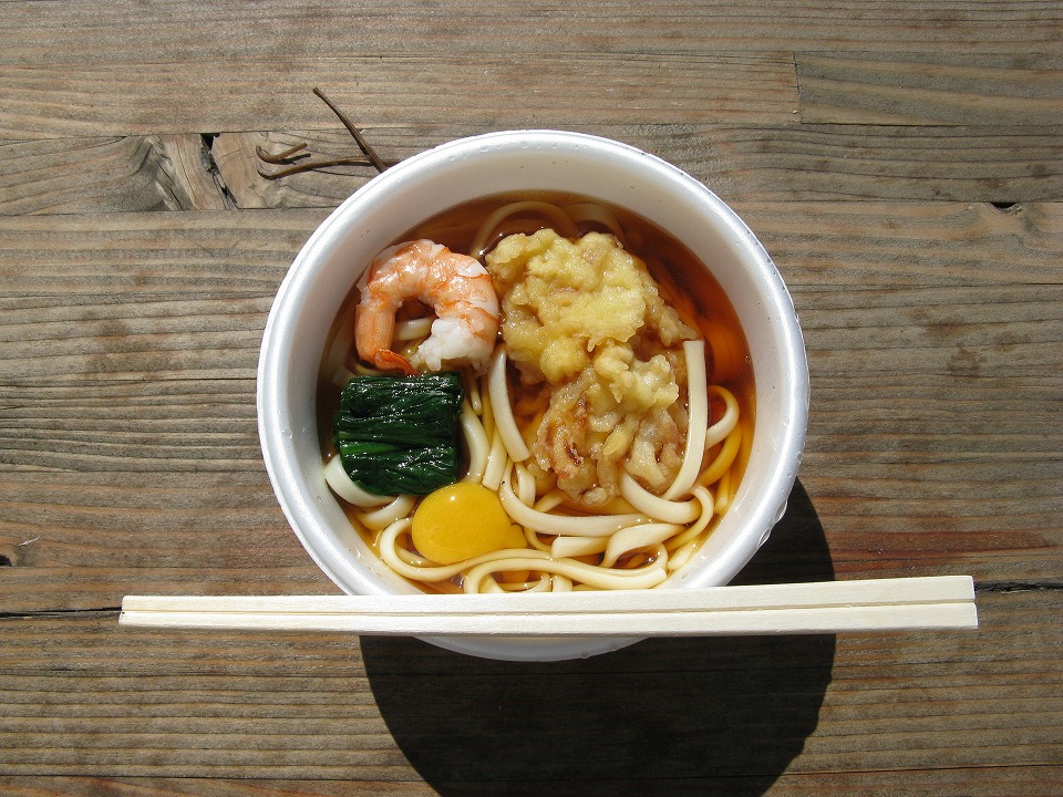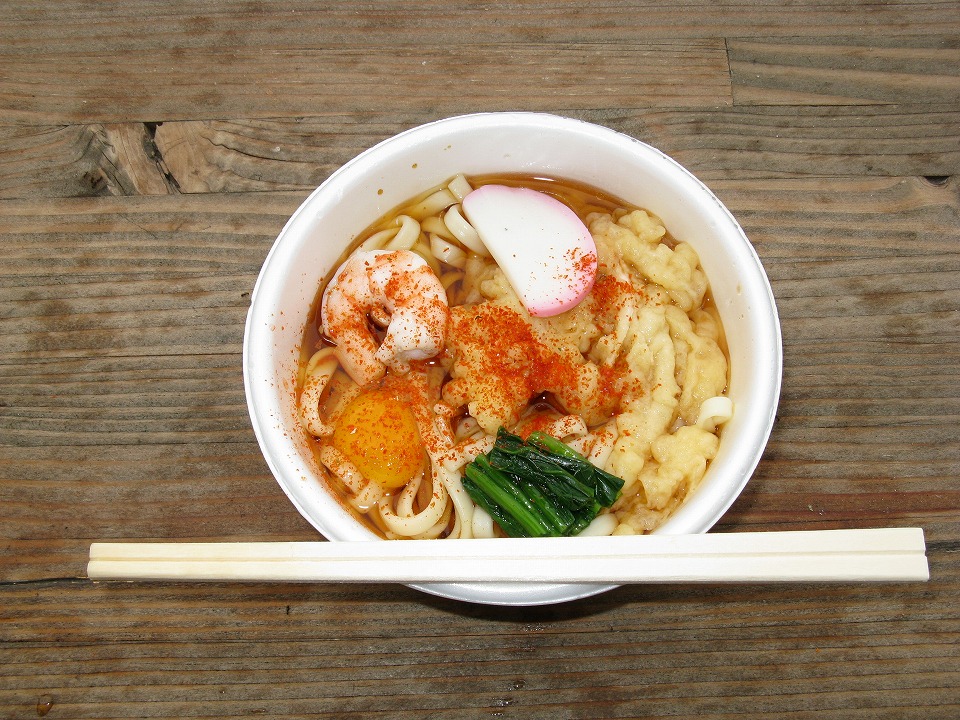 | 天ぷらうどん250円ナリ。 トッピングをしているよ。 七味は「う・そ自販機」に常備しているものなんだけど、ちょっとかかりすぎた。 ドバッと出ちゃったんだよね(苦笑)。 |