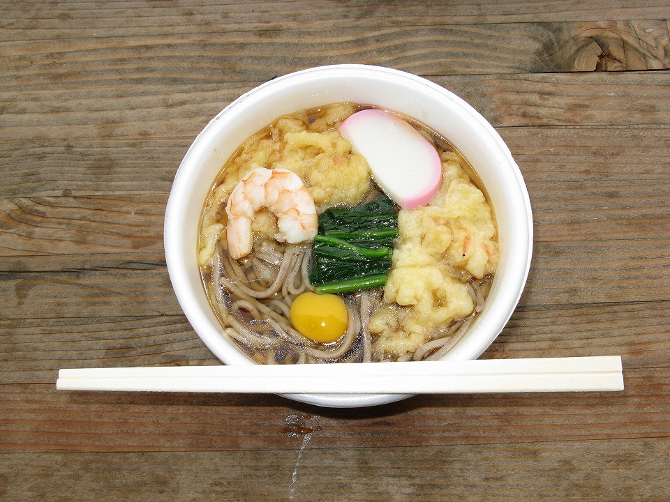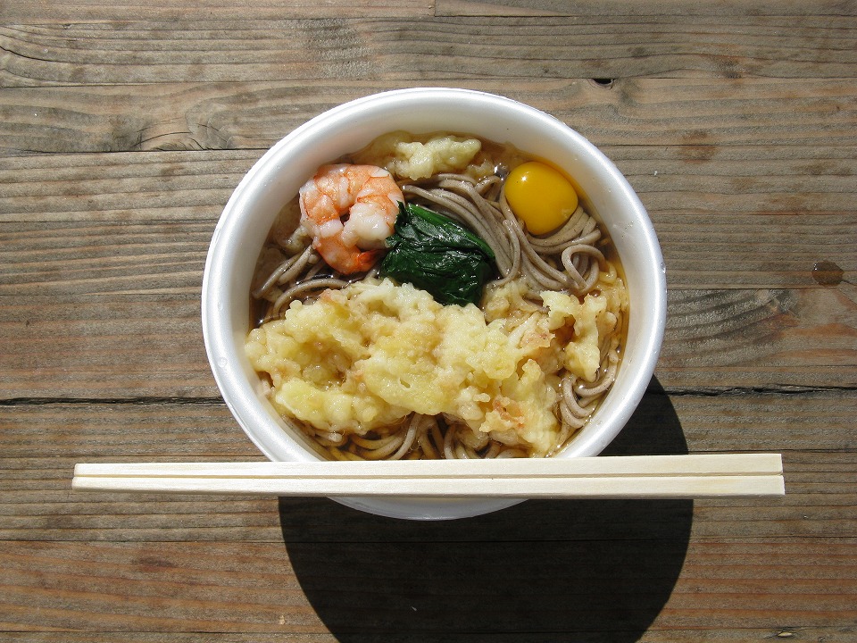 | せっかくなので?ついでに天ぷらそば250円ナリも。 もちろんトッピングもね(つまり、もともと2食分のトッピングを用意してきていた、ということですね。)。 わはは。 |