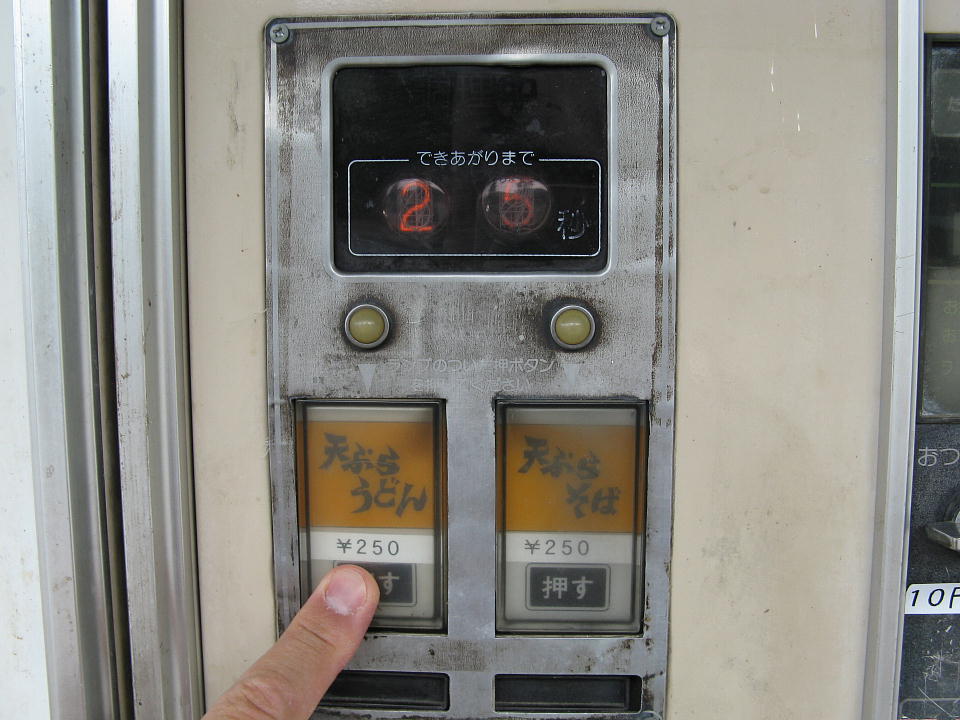 | さてさて、翌日曜日。今日も元気に撮影に行くよ。 まずは、いつもの「う・そ自販機」で朝メシ。 写真は、天ぷらうどんを選んだ直後の、ニキシー管が「25秒」(=調理時間の最長)を表示しているときのもの。 |