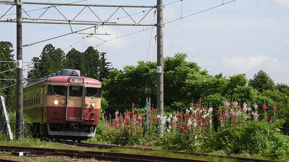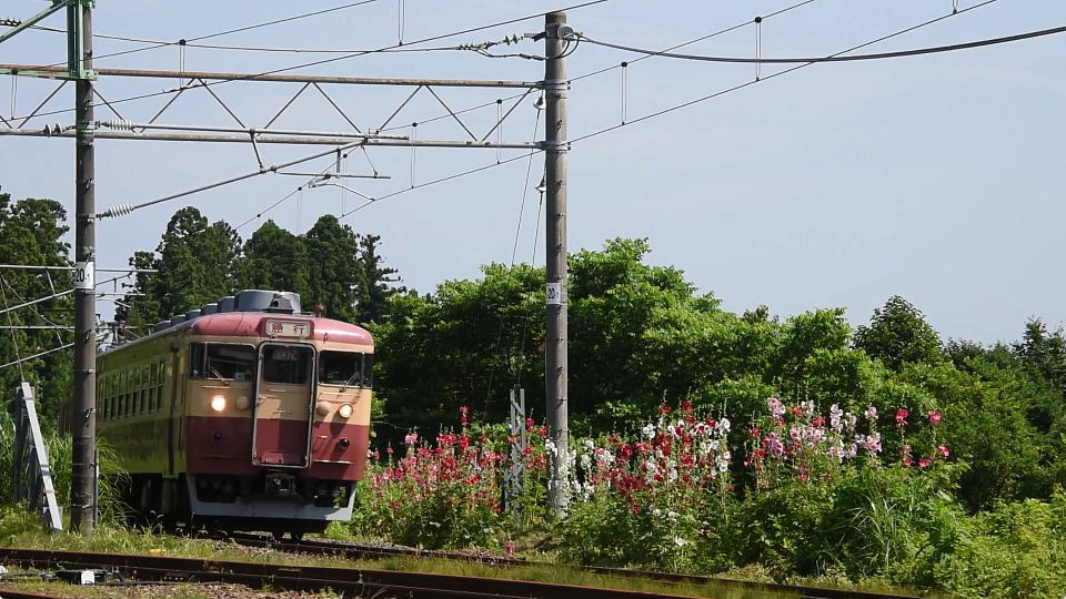 | さて、455・413系の撮影に移る。 上りの臨時鈍行8350Mを先週と同じタチアオイのポイントで狙う。 タチアオイが先週より茎の上の方まで花を咲かせている。 約30秒の動画はこちら。 今回も電車の接近音が分かりづらかったが、先週よりは録画の開始を早くできた。 |