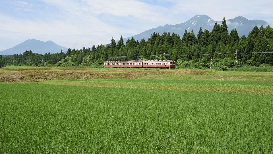 | 妙高高原で折り返してくる下り8347Mは黒姫山と妙高山をバックにして、 そして手前に田んぼを入れて狙ってみた。 約30秒の動画はこちら。 |