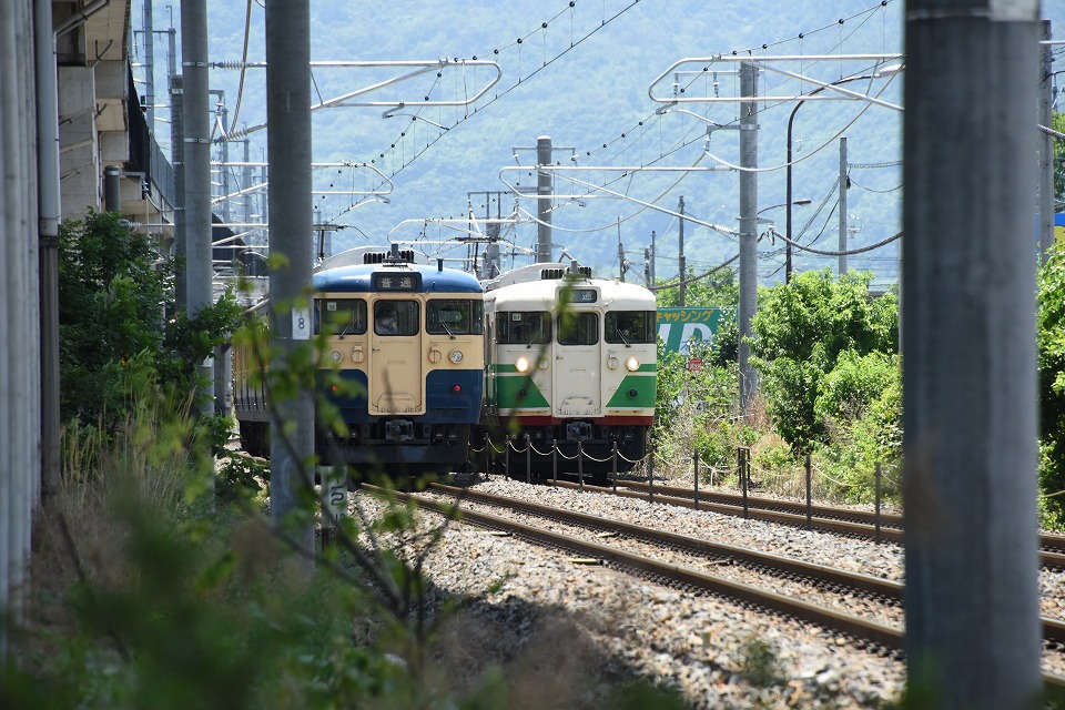 | 【おまけ】 妙高から信州に帰り、自宅でちょっと画像や動画の整理なんぞをして、 昼過ぎになって115系のすれ違いを狙いにまた出かけた。 いつもは跨線橋から撮影しているが、今回は初めて踏切で狙ってみた。 その結果がこの写真(ノートリミング)。見事にボロボロ・・・。 手前の低木が邪魔だけど、俺は切るようなことはしないからね。 |