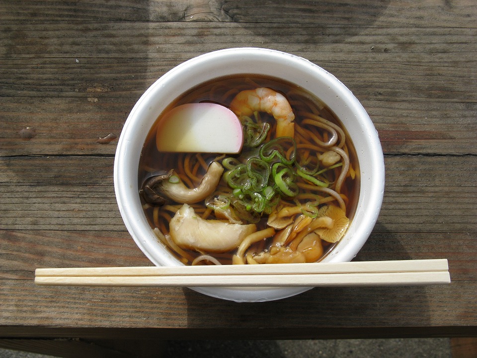 | 続いて、天ぷらそば250円ナリ。 うどんのつゆをちょっと足して、トッピングした。 |