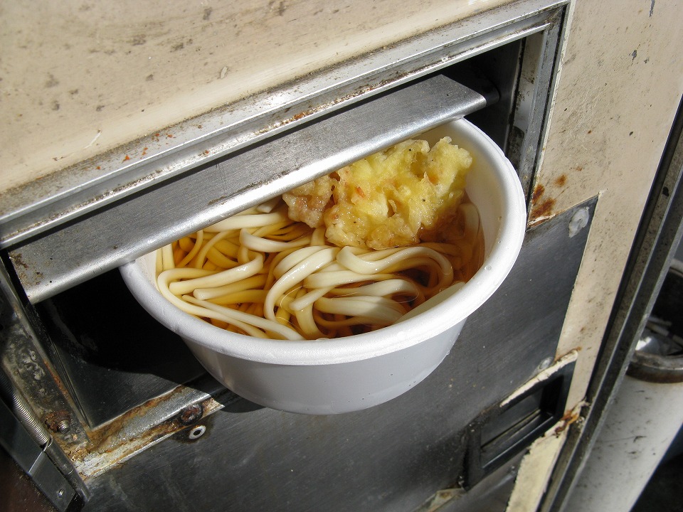 | 今日も朝メシは「う・そ自販機」の天ぷらうどん250円ナリだが、今日は何もトッピングしないで、そのままいただく。 |