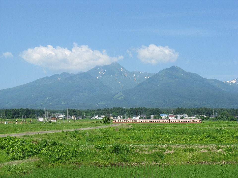 | タチアオイポイントでの撮影を終え、ちょっと妙高高原方面にクルマを走らせたら、 8350Mを追い抜いたので、ギリギリのタイミングで、妙高山を入れてコンデジで撮影できた。 ただ撮っただけ。 |