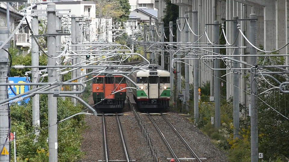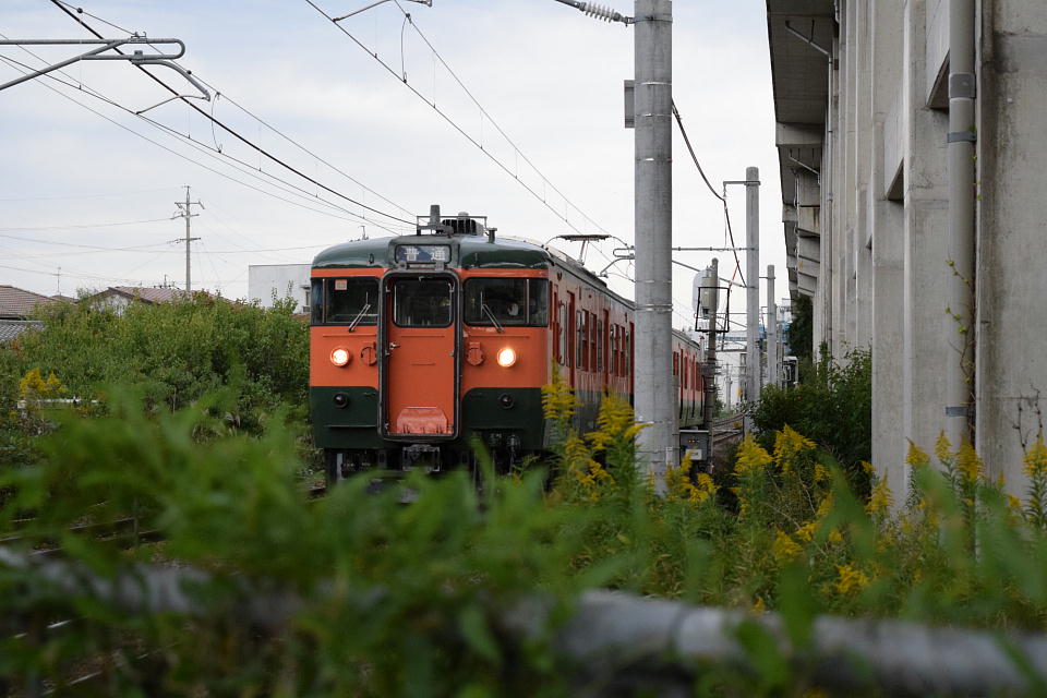 | 久しぶりに455・413系を撮影しようという週末、明日の日曜日の方が天気がよさそうなので、 今日の土曜日は、ホントにサクッと115系のすれ違い狙い。 さぁ来たゾ。今日は湘南色としな鉄色だ。 でも、う、うわ~、また俺の目の前ですれ違いそうだ。 せめてどっちかだけでも撮りたいぞ。 っということで、何とか撮影したのは湘南色の方。 ひどい写真だね・・・。 |