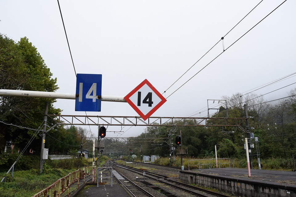 | 「う・そ自販機」のある長野県信濃町から新潟県妙高市の妙高高原駅に来た頃には、 小雨が降り始めていた。天気予報では今日の方がお天気がよさそうだったのに(涙)。 今日は天気がよくないので、妙高高原駅で撮影することにした。 妙高高原駅のホームには14両の停車目標がある。 昔、こんな長大編成の列車があった名残なんだろうね。 |