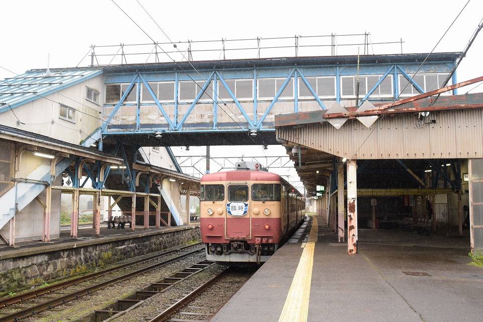 | 妙高高原駅に到着した455・413系8350M。 味のある跨線橋も入れた。 |