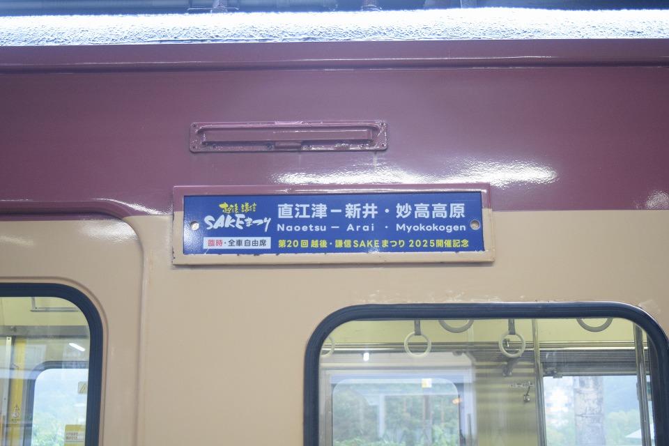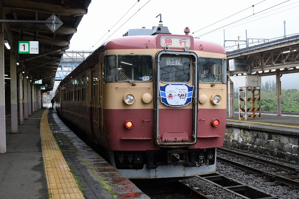| 今日は上越市での「越後謙信SAKEまつり」を記念したヘッドマークだ。 8月の「謙信公祭」のときと同じように、昼間に臨時列車として直江津~新井間を走る。 急行1~4号は運休だ。 |