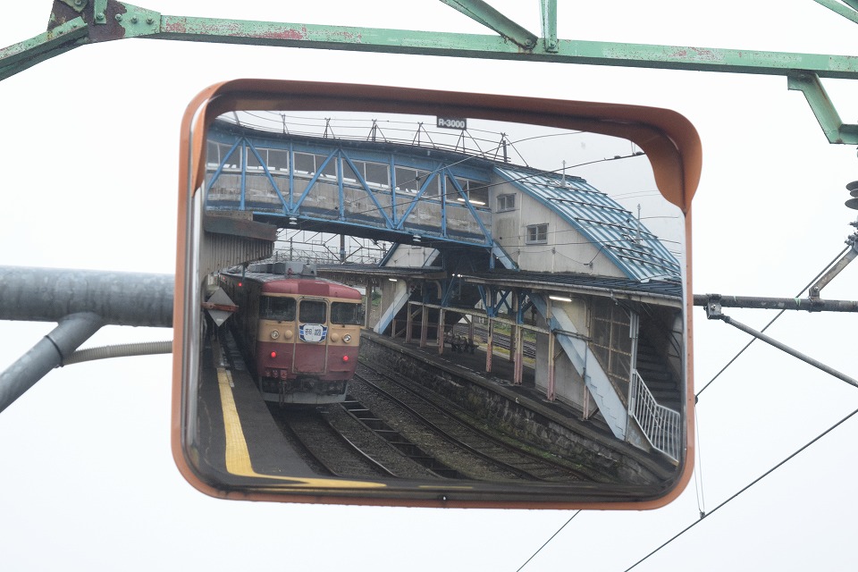 | ミラーに映った455・413系8350M。 電車をミラーの真ん中に入れて撮影したいが、そうすると俺もミラーに写っちゃうんだな。 |