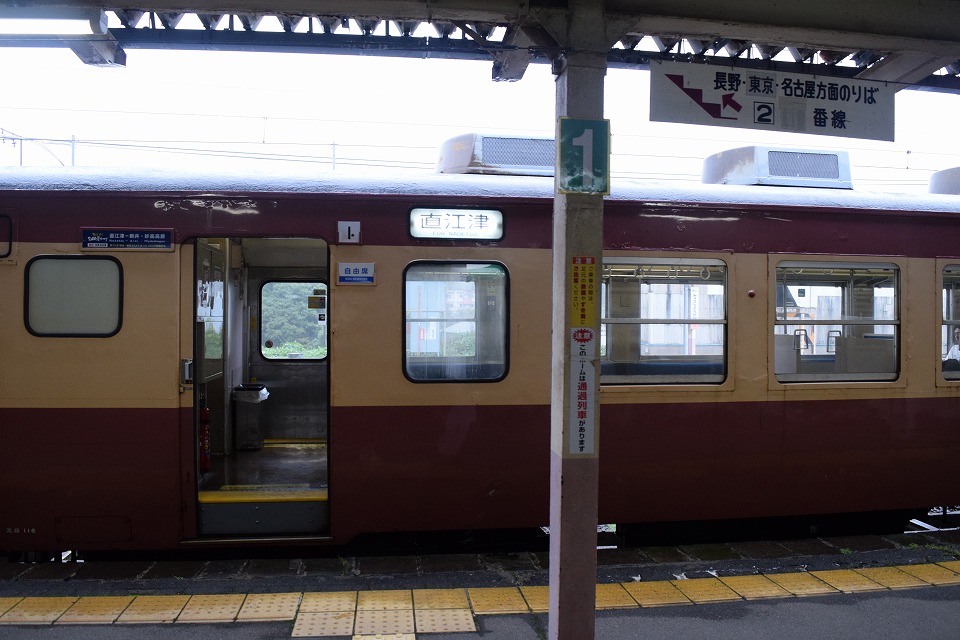 | 妙高高原駅の改札口を入ったところが1号車。 普段は1番線は使っていない。 のりば案内の「長野・東京・名古屋方面」ってのがいいね。 ホームには国鉄型の電車が佇んでいて、"昭和"の風景だ~。 |