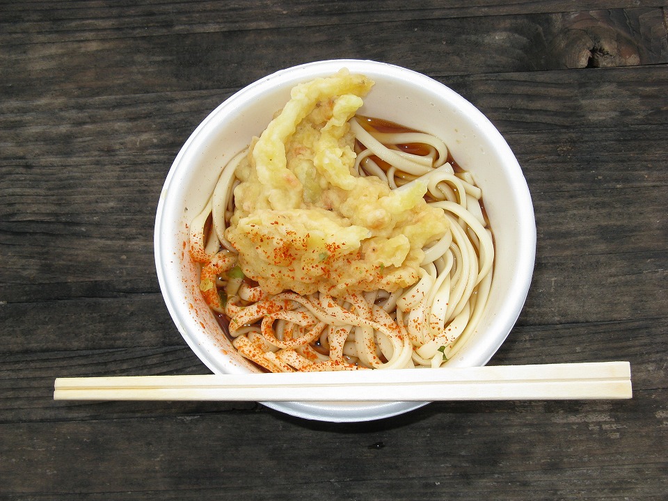 | さて、日曜日になって、イソイソと妙高方面へ出かける。 朝メシは、いつものお約束の「う・そ自販機」。 まずは天ぷらうどん250円ナリ。 つゆが、以前よりもさらに少なくなっている(笑)。オマケに珍しくぬるい。 |