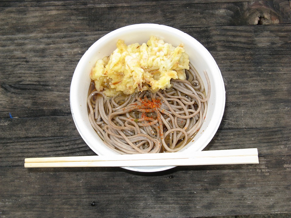 | 続いて天ぷらそば250円ナリ。 つゆは少ないが、だいぶ熱くなっていたので、よかった。 |