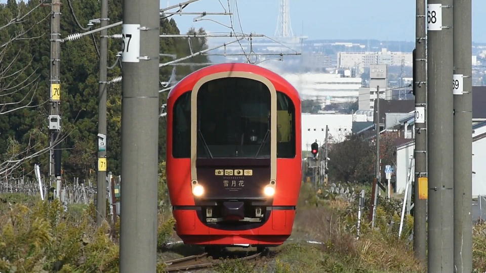 | 架線柱があってあんまりいいポイントではないんだけど新井駅の南で撮影することにした。 いつもは8350Mのあとに走るので俺は撮影対象にしていない「雪月花」だが、今日は455・413系より前に走るので練習で撮影した。 長いのをテキトーに編集した約30秒の動画はこちら。 |