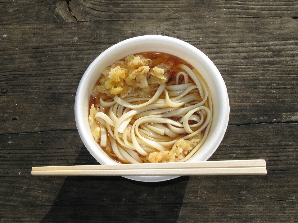 | 天ぷらうどん250円ナリ。 今日はトッピングをせず、この写真は出てきたそのまま。相変わらず最近の傾向でつゆが少ない。 いっただっきま~す。 |