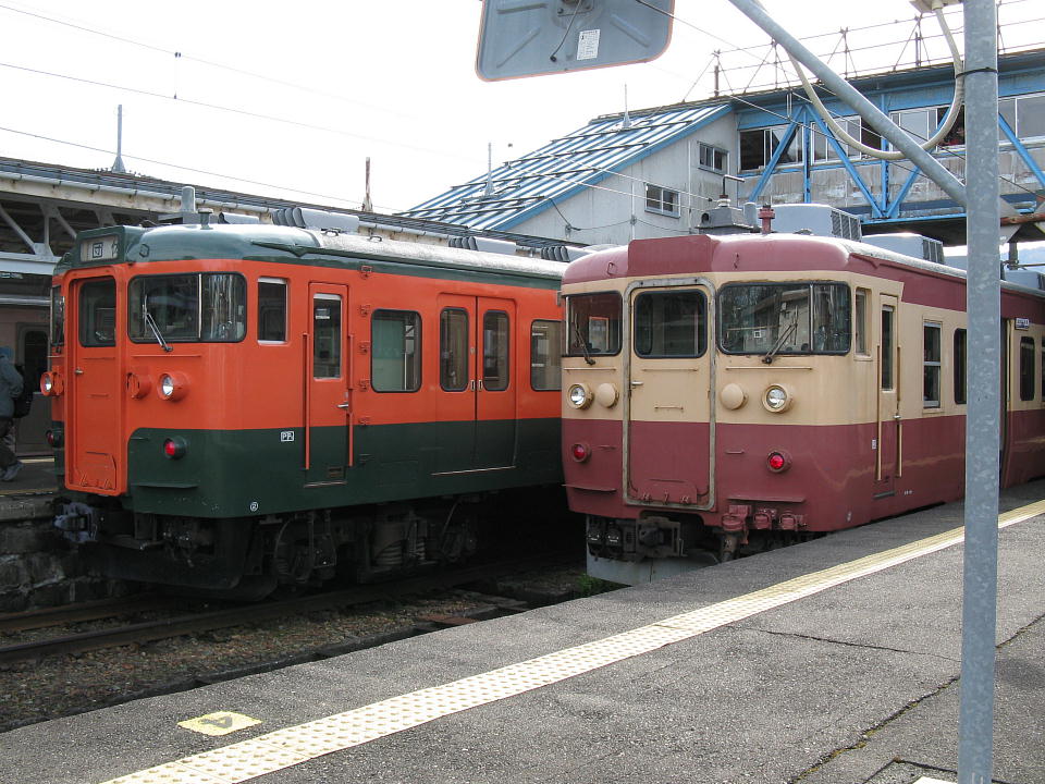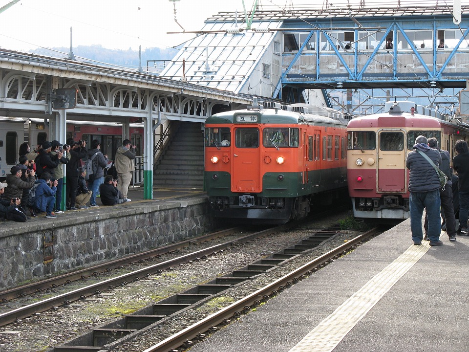 | のんびり昼メシを喰って妙高高原駅に来てみたら、おお~、テツどもがいるわいるわ。 以前は、455・413系快速と115系の湘南色がここで行き会うことがあったね。 |