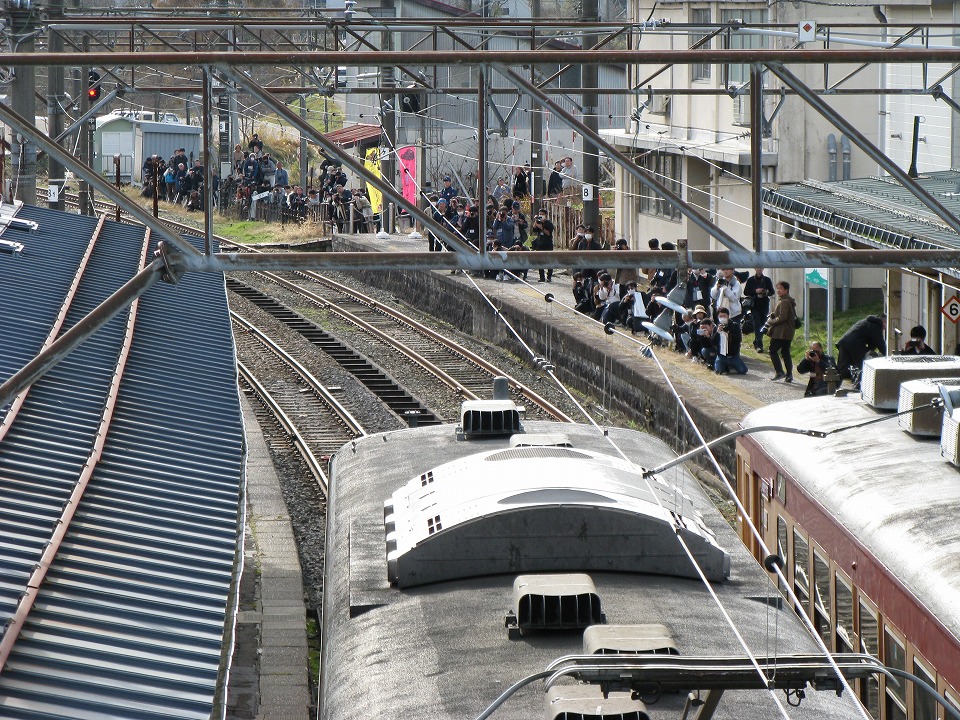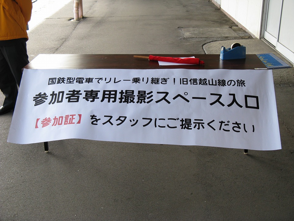 | 長野方には撮りテツがたくさん。 455・413系にはどうやら限定のヘッドマークが付いているらしい(未確認)。 ホームに入れるのは、ツアー参加者限定の特典。 ホーム外にいるのは、ただの撮りテツ。 |