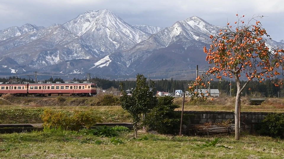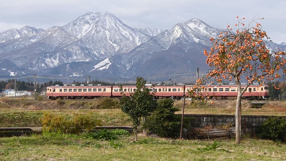 | 455・413系の上り8350Mは晩秋というか初冬というかの風景で撮影する。 約45秒の動画はこちら。 このポイントは先週来たときに目を付けていて、相当低いアングルにしなければいけないので、今回はミニ三脚を使っている。 実は、山のすぐ上に電線が横たわっているので、妙高山と柿の木を両方入れようとすると、アングルがヒジョーに厳しい。 よ~く見ると、この画像の右上に黒い「点」のようなものが映って(写って)いるが、これが電線だ。 ギリギリで外すようにズーミングしたつもりだったが入り込んでしまった。 |