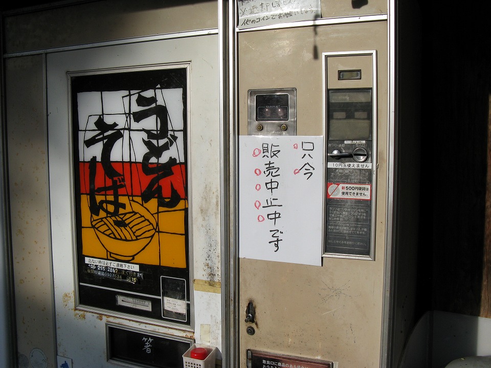 | さぁ、3連休の最終日。きょうもお天気はまぁまぁよさそうなので、いつもの「う・そ自販機」で朝メシ喰って・・・ と思いつつ、イソイソとやってきたら、ががが~ん! 販売中止中だって。 ついに壊れたか。 ここ最近、つゆが少なかったり、やたらぬるかったり、かと思えばつゆが溢れるほど多くて味が薄い なんてことが続いてたからな~。無事に修理されて再稼働してくれることを切望する。 |