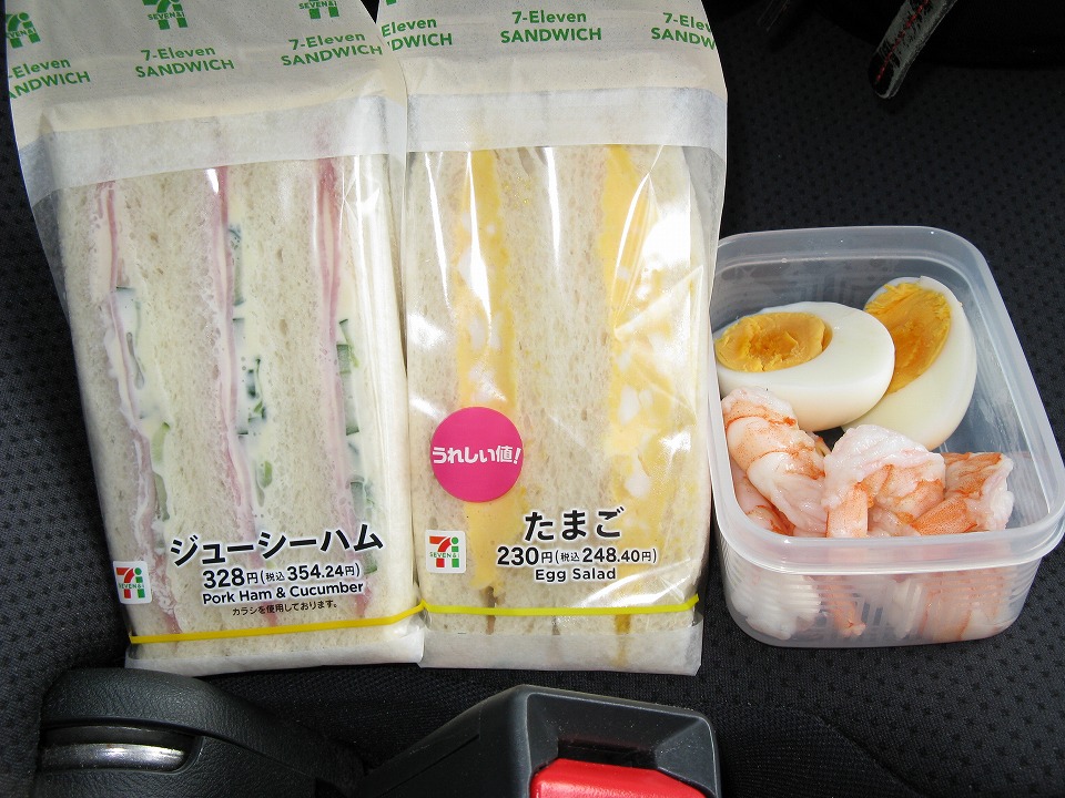 | 「う・そ自販機」のうどん・そばが喰えなかったので、トッピングに持って来たエビたまに合いそうなサンドイッチをイレブン屋でセレクトして朝メシにした。 |