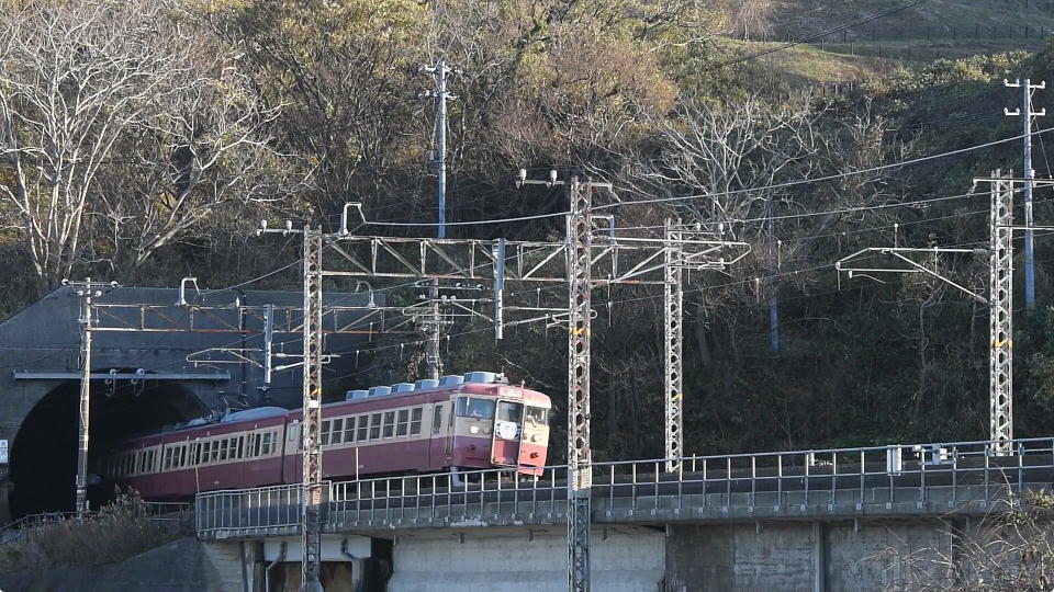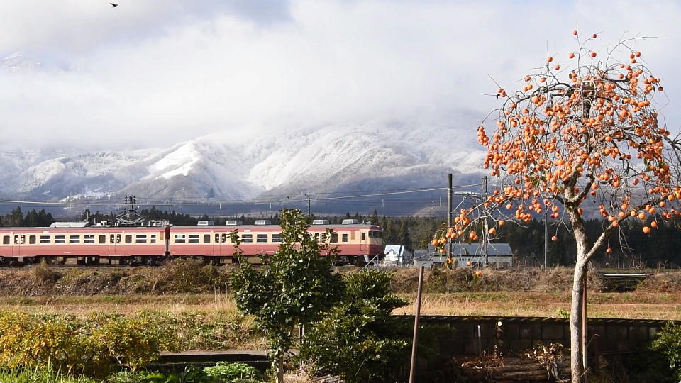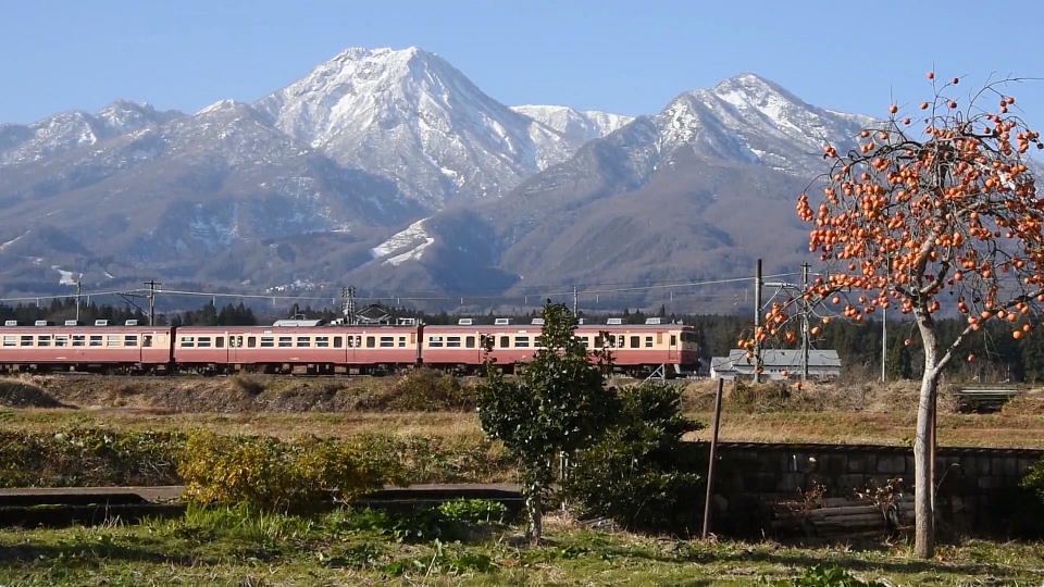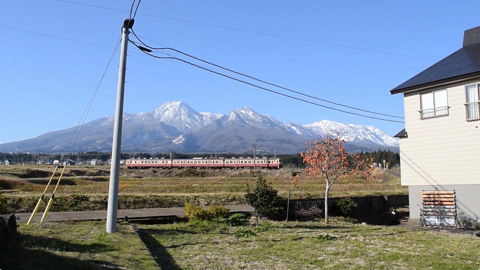 | ちなみに、このポイントでほぼ標準の画角で撮影した約33秒の動画はこちら。 妙高山のすぐ上に電線が横たわっていて、妙高山と柿の木を入れようとすると、カメラをかなり低く構えないといけない。 ただ、低いアングルにすると今度は柿の木の左の緑の小木が邪魔をするんだけど、しかたない。 かといって木々が生えている近くまで行こうにも、ここはよそ様の土地だから勝手に入るわけにはいかない。 こういうときにバカな撮りテツは、土地に入り込んだり、木を切っちゃったりするんだろうね。 |