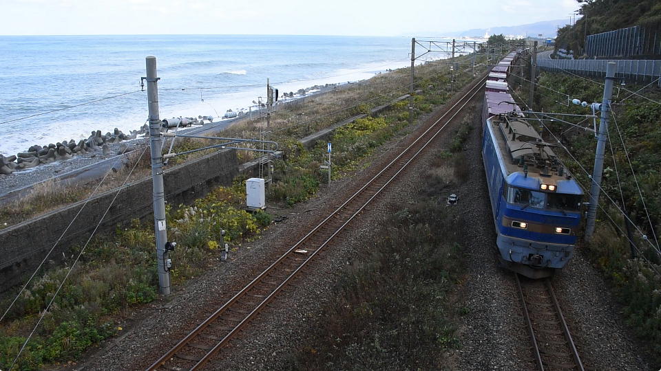 | 「急行1号」のちょっと前に通った貨物。今日は俺が好きな北斗星色のEF510-501が牽引していた。 この画像は動画からのキャプチャー。動画はUPするほどのものではないので画像だけにしておく。 |