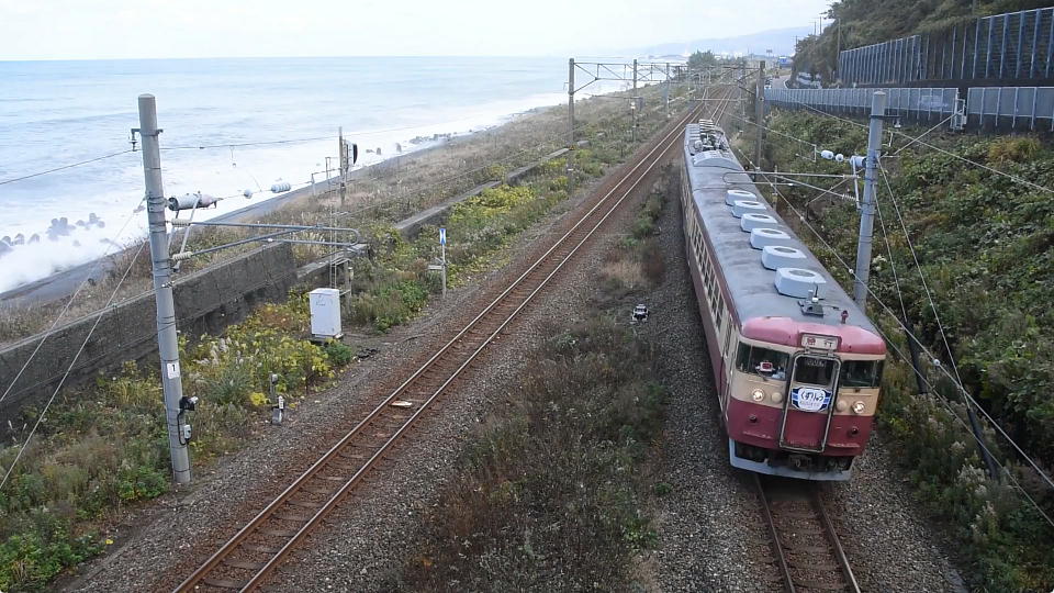 | 「急行1号」をどこで撮影しようかと何となく青海まで来た。 日本海がそこそこ荒れているので、その様子を入れて撮影することにした。 ポイントに到着したらトンネルに設置してある、列車接近を知らせるランプが点滅し始めたので、 何か来るんだなと思っていたら、鈍行の1636Dだった。 一応撮影しておくか、とコンデジでテキトーに構えていたら、突然写真左の下り線のトンネルから「雪月花」が飛び出してきた。 慌ててアングルを左の寄せたんだけど、このとおりメチャクチャな写真になっちゃった。 |