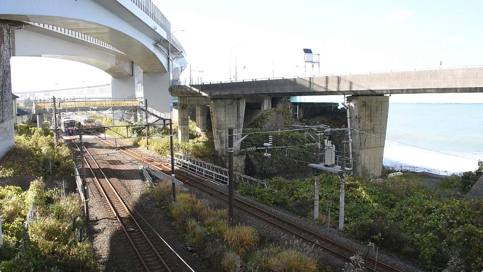 | 「急行2号」は親不知駅近くの、北陸道(左上)や国道8号の高架(右上)が見える場所で撮影。 約25秒の動画はこちら。 ちょうど1638Dもやって来て、すれ違いになった。 |
