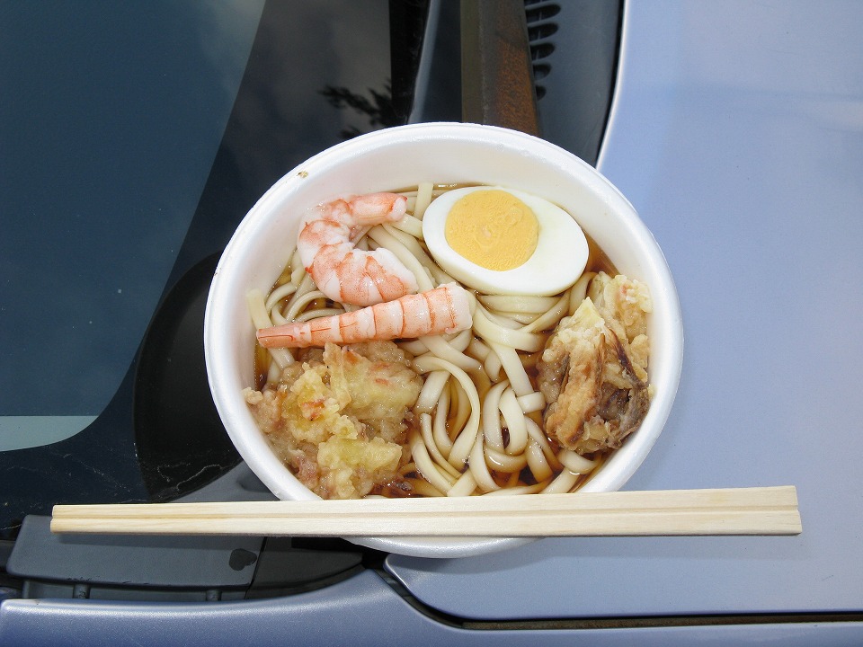 | まずは天ぷらうどん250円ナリ。 敷地内にあるミニテーブルに上越チームが陣取っていたので、俺はクルマに丼を置いて撮影。 エビたまはもちろん自宅から持って来たトッピングだ。 ど~でもい~けど、 茹で卵は包丁ではなく釣り糸で切ったので、切断面がきれいでしょ。 撮影後は立ち喰い(笑)。 |