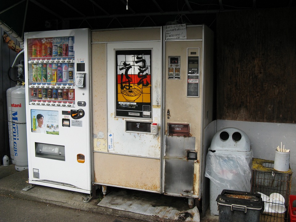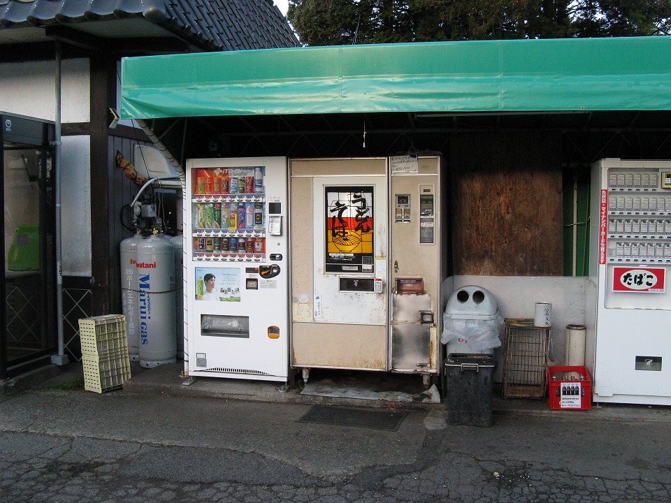 | 朝メシはいつもの「う・そ自販機」。 俺が着いたときは、上越ナンバーの2チーム6人がわいわいとズルズルすすっていた。 |