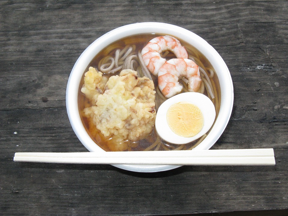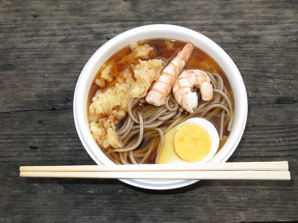 | 続いて天ぷらそば250円ナリ。 上越チームが移動していったので、ミニテーブルに置いて撮影&実食。 |